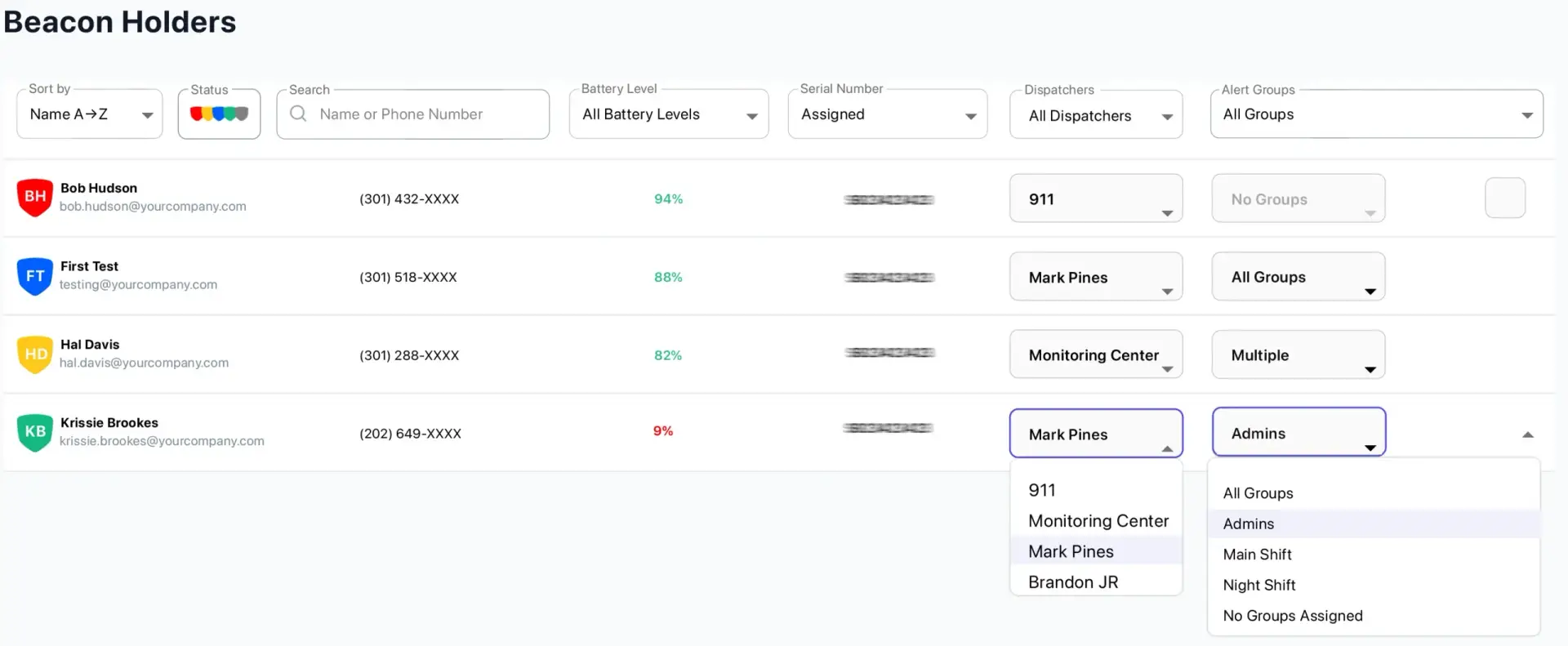 IMPORTANT! Each Beacon Holder must have a Dispatcher selected. If a Dispatcher is not chosen, the Beacon Holder will not be able to place a call in an emergency.