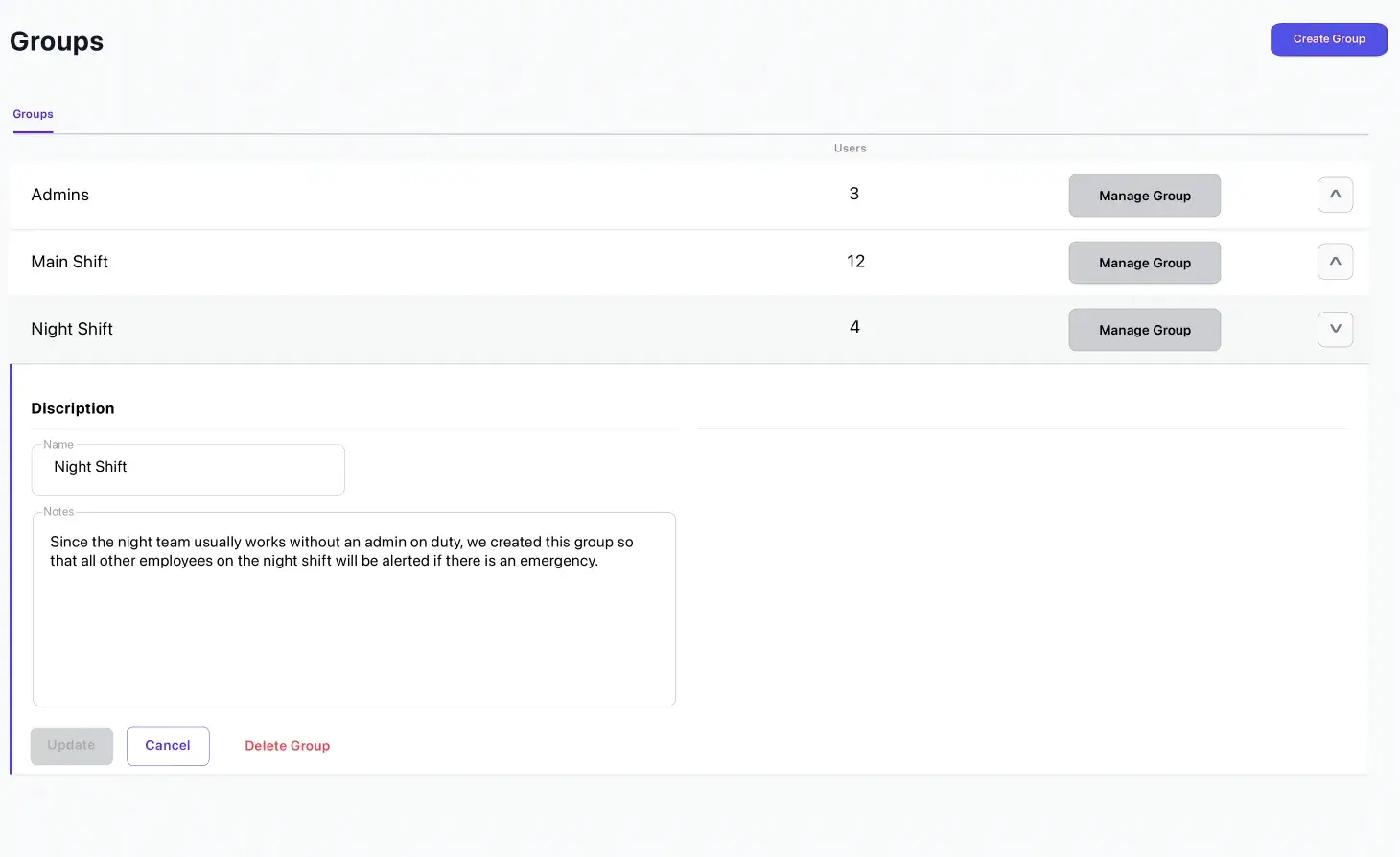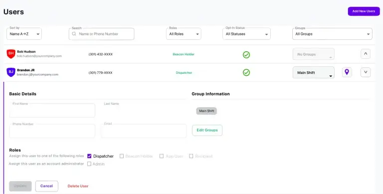 Many companies form groups by team, department, or office location. It’s a good idea to create a group named ‘All Users’ for company-wide alerts. Additionally, many companies make a group called ‘Managers’ to ensure that management receives notifications during emergencies. You can create more groups anytime.