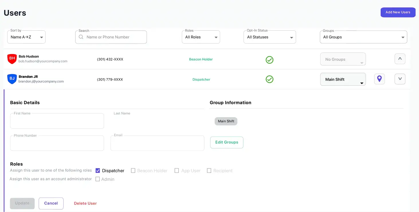 This section houses all users on the portal, including Administrators, Beacon Holders, and alert Recipients. To modify or add roles, simply toggle the corresponding role within the user’s page.